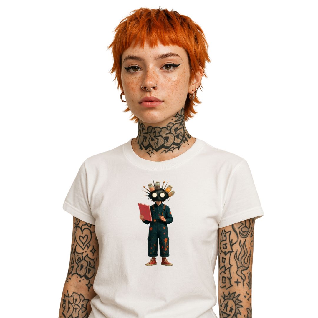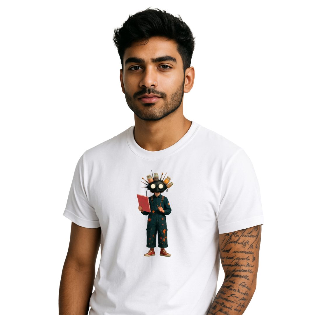Pigmentronâs world is made of colors. He canât speak his emotionsâhe draws them. His head is full of brushes, jars, and thoughtsâall ready to burst. His sketchbook isnât a diary; itâs his mind. He wears a mask because the real world is too messyâit smears colors like mud. He wants to color everything, but sometimes, he draws in black too. Because in his world, beauty canât be controlledâit just leaks out.